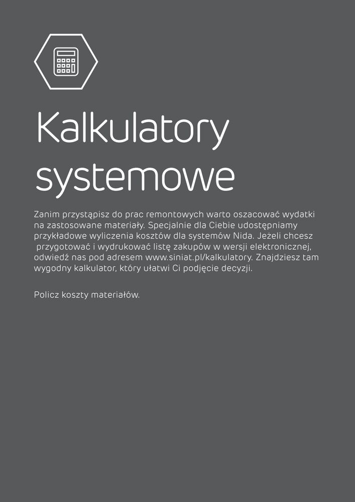 Znajdziesz tu wyliczenia kosztów dla różnych systemów suchej zabudowy Nida, np. dla celu oszacowania swoich wydatków na remont.