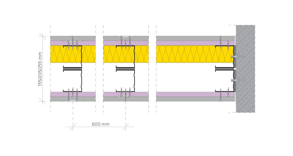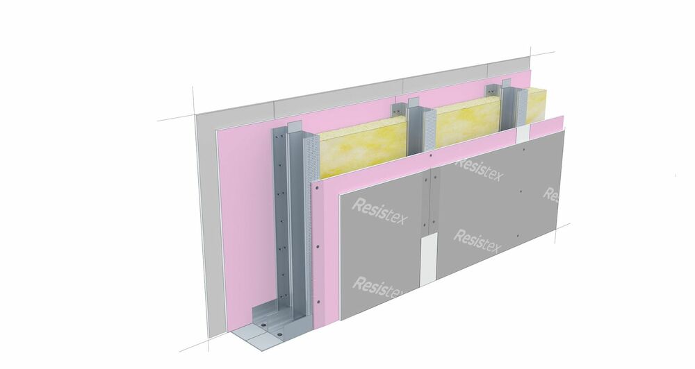 System ściany antywłamaniowej Nida Ściana 155BB50/Ogień Plus + Resistex zbudowany z płyt Nida Ogień Plus i Resistex z wykorzystaniem profilu zdwojony 2x zdwojony Nida C50 . Zapewnia klasę odporności na włamanie RC2 oraz klasę odporności ogniowej (R)EI120.